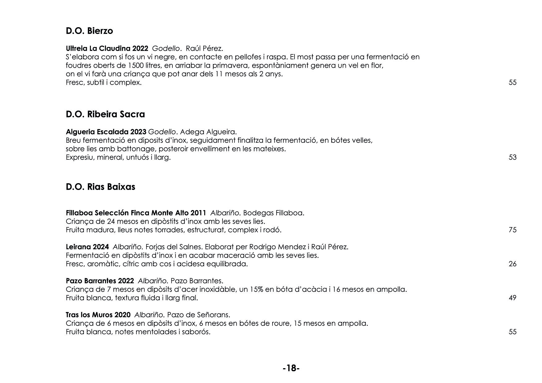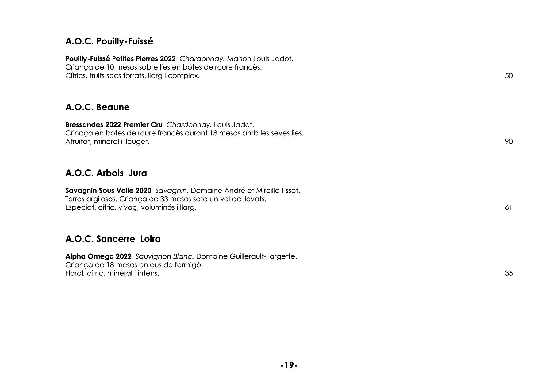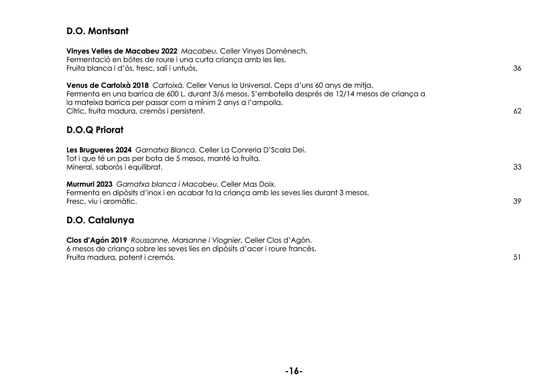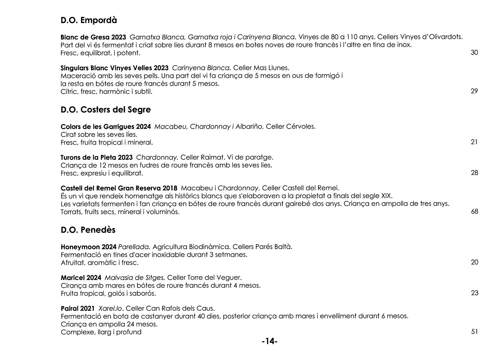 En el nostre celler podreu tastar tota classe de vins, pensats per harmonitzar els vostres àpats. Tenim més de 150 referències. EL NOSTRE CELLER ELS MÉS ATREVITS VINS A COPES VINS ESCUMOSOS VINS BLANCS VINS ROSATS VINS NEGRES VINS DOLÇOS PER LA SOBRETAULA BLANCS RESERVES XEC REGAL