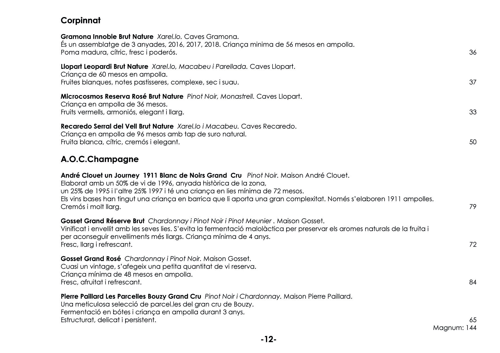En el nostre celler podreu tastar tota classe de vins, pensats per harmonitzar els vostres àpats. Tenim més de 150 referències. EL NOSTRE CELLER ELS MÉS ATREVITS VINS A COPES VINS ESCUMOSOS VINS BLANCS VINS ROSATS VINS NEGRES VINS DOLÇOS PER LA SOBRETAULA ESCUMOSOS RESERVES XEC REGAL