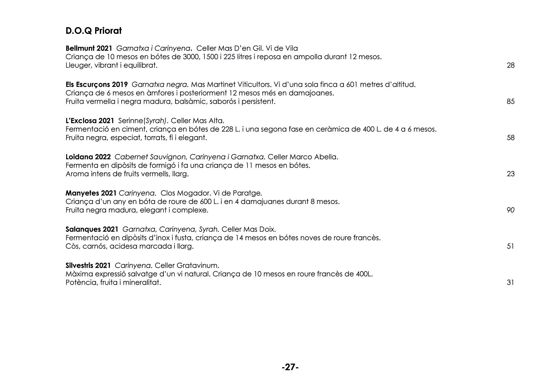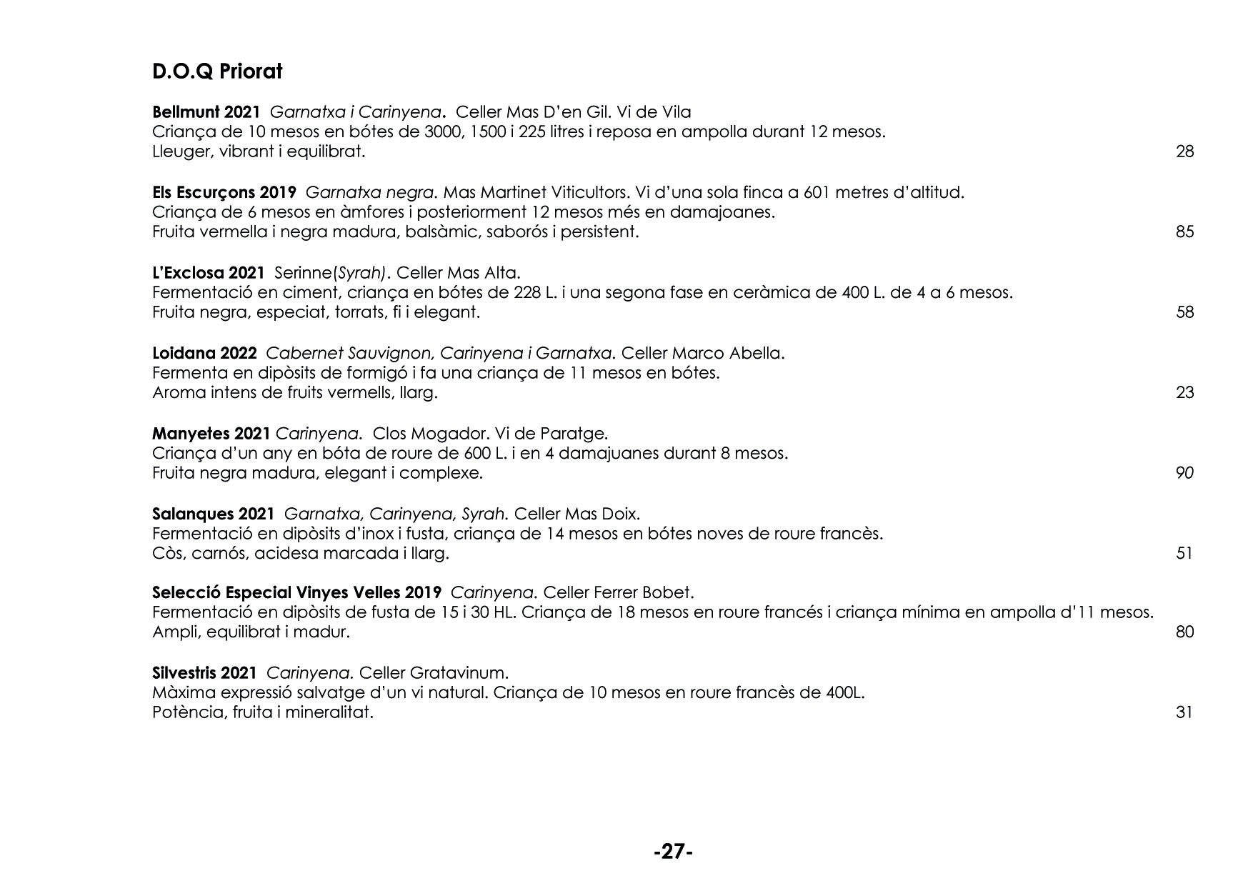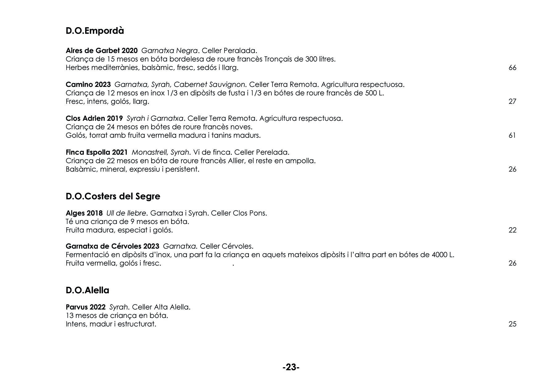 En el nostre celler podreu tastar tota classe de vins, pensats per harmonitzar els vostres àpats. Tenim més de 150 referències. EL NOSTRE CELLER ELS MÉS ATREVITS VINS A COPES VINS ESCUMOSOS VINS BLANCS VINS ROSATS VINS NEGRES VINS DOLÇOS PER LA SOBRETAULA NEGRES RESERVES XEC REGAL